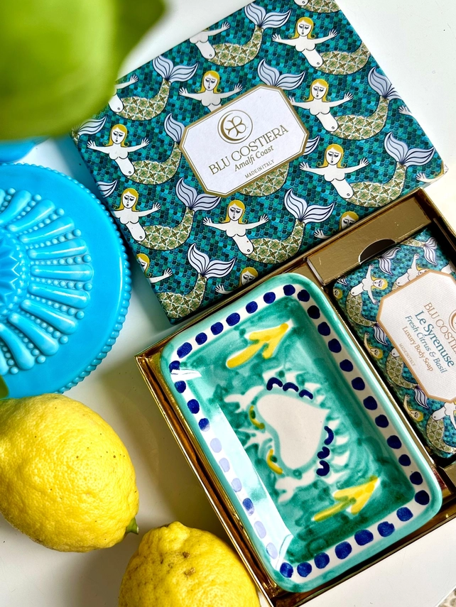 Un set de regalo 100% italiano inspirado en la frescura del mar. La “Línea Sirena” contiene un jabón artesanal vegano (aroma cítrico de limón y albahaca) y una exclusiva jabonera de cerámica de Vietri, pintada a mano. El regalo ideal para una ocasión especial.